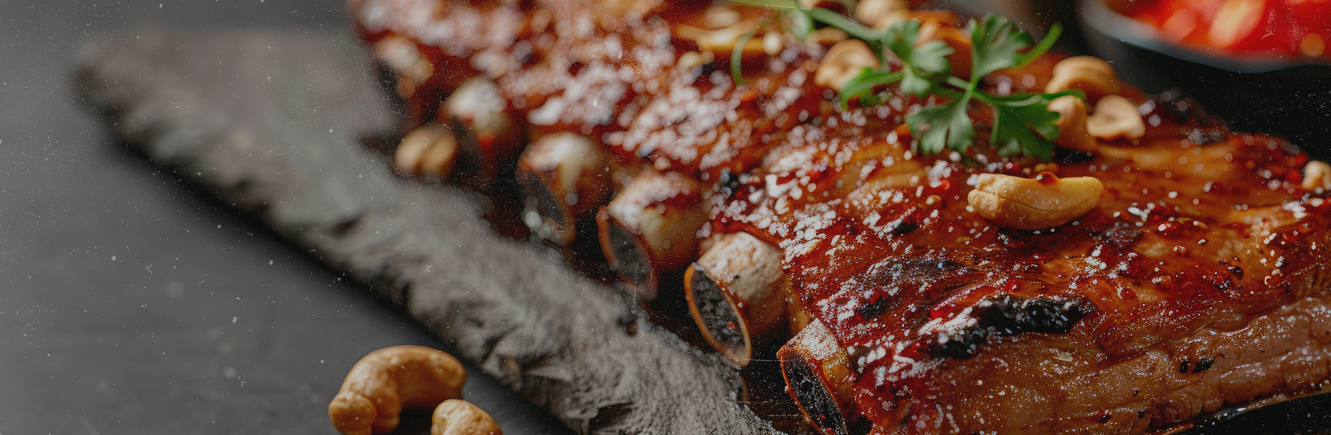 Bata a castanha-de-caju no pilão até formar uma farofa grossa e reserve. Ainda no pilão (nem precisa lavar), bata 1 dente de alho com ½ colher (chá) de sal até formar uma pasta. Junte a geleia de laranja e misture bem. Com uma colher, espalhe a geleia temperada sobre a costela e salpique a castanha-de-caju. Leve ao forno para assar por cerca de 25 minutos ou até dourar. Enquanto isso, corte as cebolas em quartos, passando a faca pela raiz e descasque – assim os gomos ficam unidos. Descasque os dentes de alho.